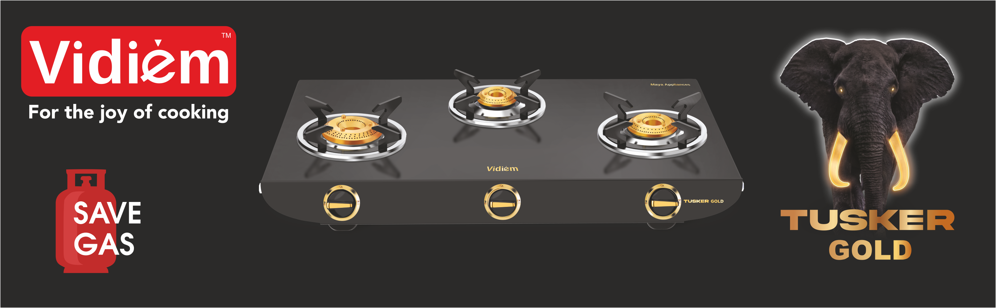 • Vidiem Tusker Gold the new addition to tusker series of Gas Cook Tops,2mm thick single piece powder coated RustProof Body, Extra Large Cooking Surface & Widely Spaced Burners to accommodate Large Vessels with Jumbo, Medium & Small Dura Forged Brass Burners