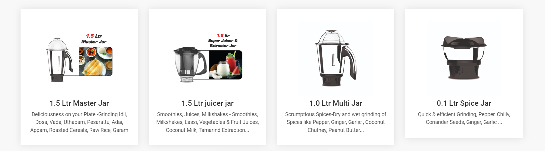 ✅ Self-Locking Jars ensure secure mating of Jar with Mixer Base eliminating wear and tear of Couplers and allows for easy “Pick & Place” of Jars. Tri-Mate Couplers are self-aligning, high strength & designed to withstand the high torque and load required for tough grinding applications suited to Indian cooking.
