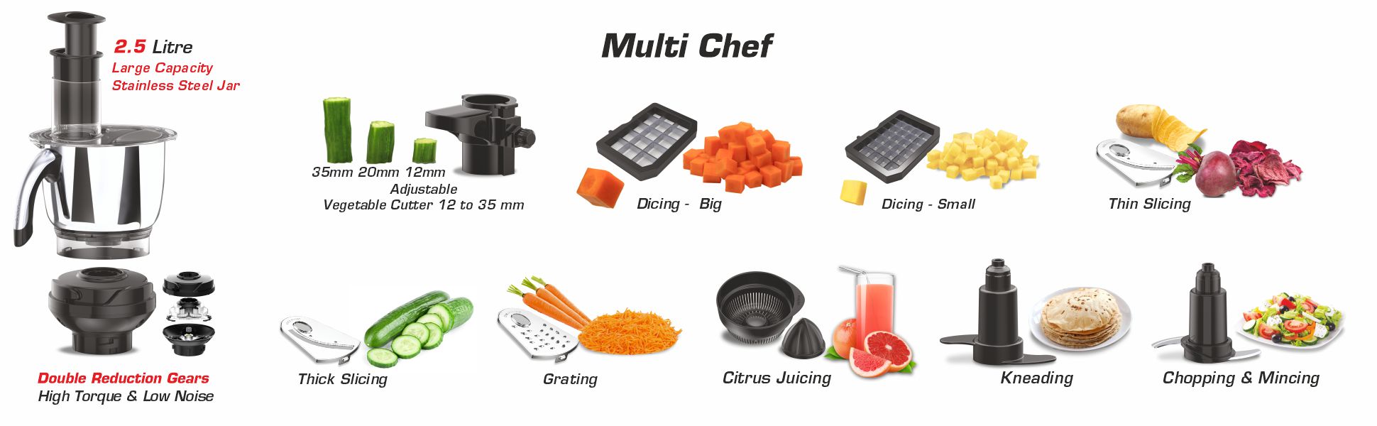 ✅ Vidiem TUSKER - The Multitasker with Adjustable Vegetable Cutter - 12 mm to 35 mm, Dicing 10 mm & 15 mm, Thick & Thin Slicing,Grating, Chopping, Mincing, Kneading, Citrus Juicing, Mixing, Grinding, Crushing, Blending, Liquidising, … 2.5 Litre Stainless Steel Multi Chef with Double reduction Gear Box for High Torque & Low Noise with Polycarbonate Lid & Silicone Gaskets